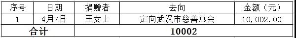 一、捐款使用情况 新增拨出捐赠款1笔,合计10002元,具体去向明细如下表:
